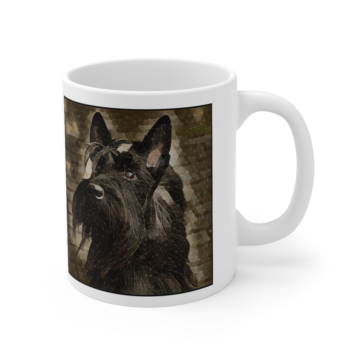 Keep cozy and warm with a nice cuppa, featuring the beloved Scottish Terrier dog breed stylized in our Coloromo Rock Candy art on a ceramic mug. Lead and BPA-free, these durable mugs are also microwave & dishwasher-safe. Made of white, resilient ceramic in an 11-ounce size, this is the perfect gift for coffee, tea, and hot chocolate lovers.