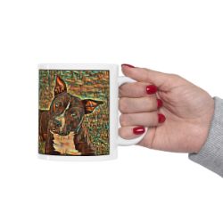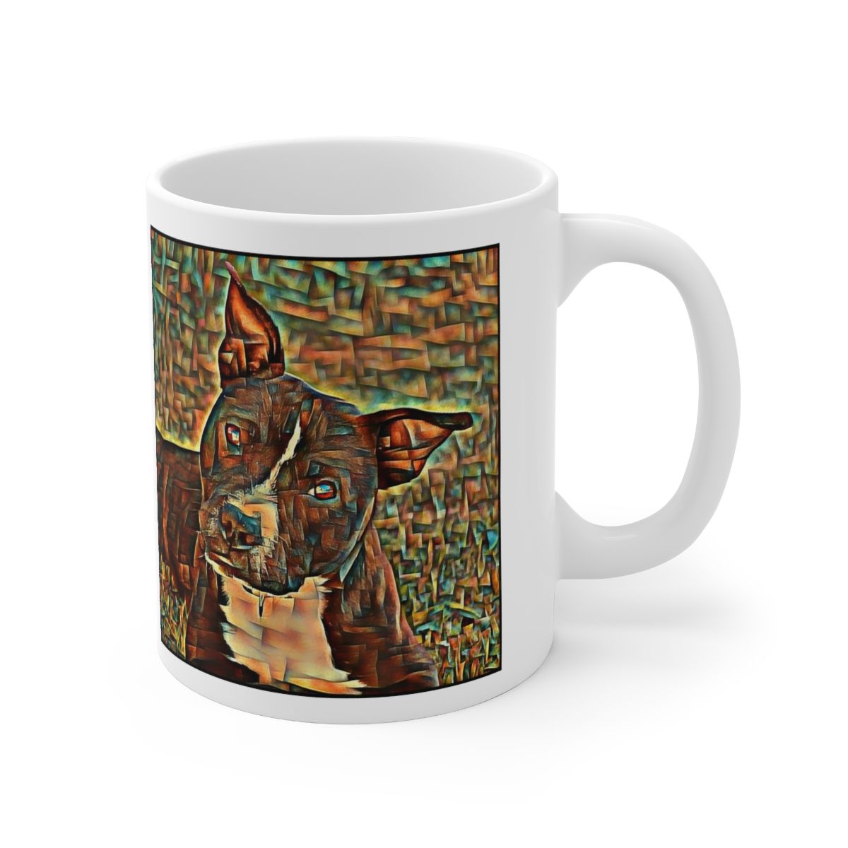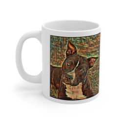 Keep cozy and warm with a nice cuppa, featuring the beloved Staffordshire Bull Terrier dog breed stylized in our Coloromo Cool Cubist art on a ceramic mug. Lead and BPA-free, these durable mugs are also microwave & dishwasher-safe. Made of white, resilient ceramic in an 11-ounce size, this is the perfect gift for coffee, tea, and hot chocolate lovers.