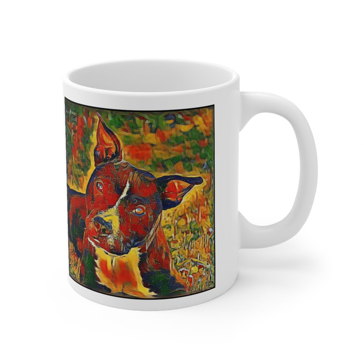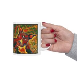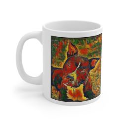Keep cozy and warm with a nice cuppa, featuring the beloved Staffordshire Bull Terrier dog breed stylized in our Coloromo Garden Veggie art on a ceramic mug. Lead and BPA-free, these durable mugs are also microwave & dishwasher-safe. Made of white, resilient ceramic in an 11-ounce size, this is the perfect gift for coffee, tea, and hot chocolate lovers.