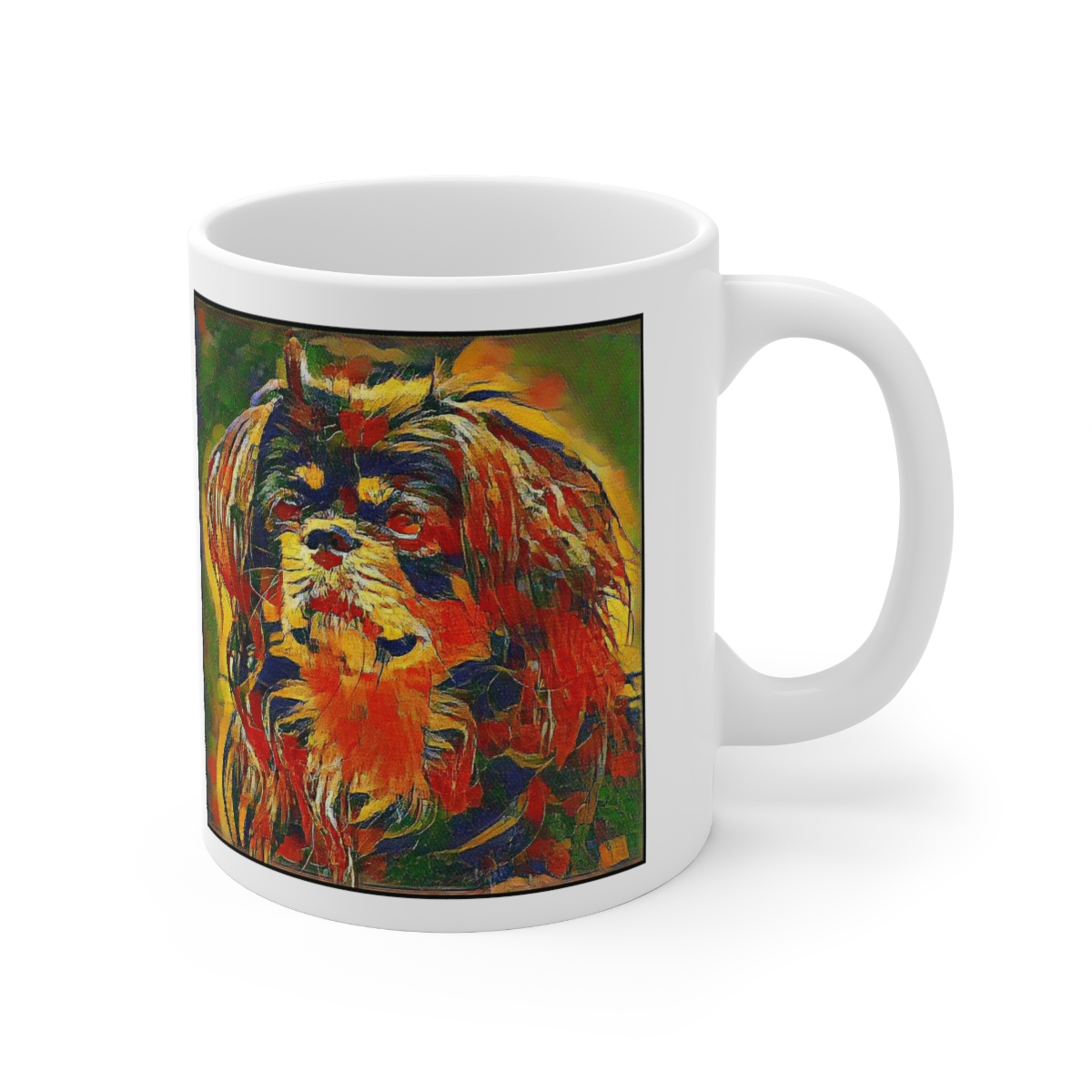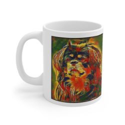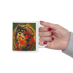 Keep cozy and warm with a nice cuppa, featuring the beloved Tibetan Spaniel dog breed stylized in our Coloromo Garden Veggie art on a ceramic mug. Lead and BPA-free, these durable mugs are also microwave & dishwasher-safe. Made of white, resilient ceramic in an 11-ounce size, this is the perfect gift for coffee, tea, and hot chocolate lovers.