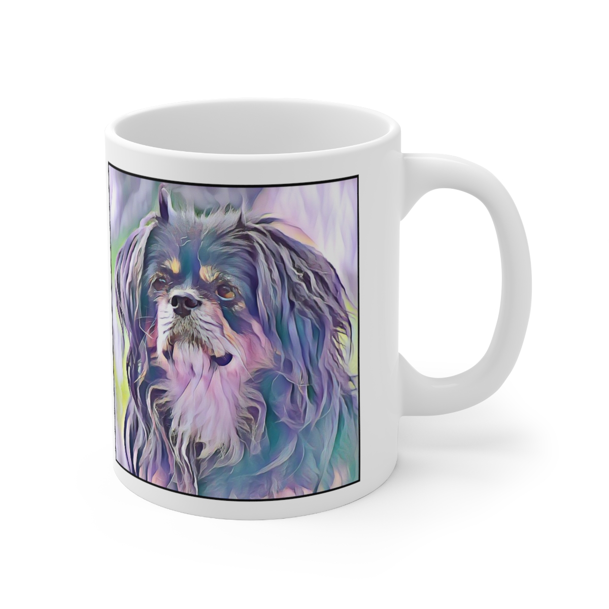 Keep cozy and warm with a nice cuppa, featuring the beloved Tibetan Spaniel dog breed stylized in our Coloromo Lavender Ice art on a ceramic mug. Lead and BPA-free, these durable mugs are also microwave & dishwasher-safe. Made of white, resilient ceramic in an 11-ounce size, this is the perfect gift for coffee, tea, and hot chocolate lovers.
