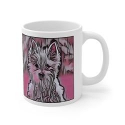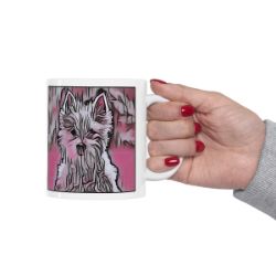 Keep cozy and warm with a nice cuppa, featuring the beloved West Highland Terrier dog breed stylized in our Coloromo Comic Pink art on a ceramic mug. Lead and BPA-free, these durable mugs are also microwave & dishwasher-safe. Made of white, resilient ceramic in an 11-ounce size, this is the perfect gift for coffee, tea, and hot chocolate lovers.