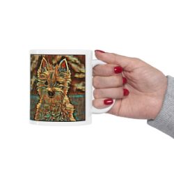 Keep cozy and warm with a nice cuppa, featuring the beloved West Highland Terrier dog breed stylized in our Coloromo Cool Cubist art on a ceramic mug. Lead and BPA-free, these durable mugs are also microwave & dishwasher-safe. Made of white, resilient ceramic in an 11-ounce size, this is the perfect gift for coffee, tea, and hot chocolate lovers.