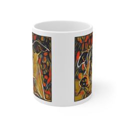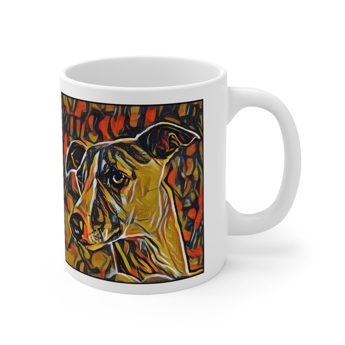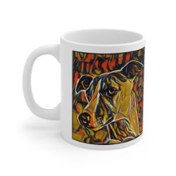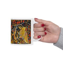 Keep cozy and warm with a nice cuppa, featuring the beloved Whippet dog breed stylized in our Coloromo Graffiti Haus art on a ceramic mug. Lead and BPA-free, these durable mugs are also microwave & dishwasher-safe. Made of white, resilient ceramic in an 11-ounce size, this is the perfect gift for coffee, tea, and hot chocolate lovers.